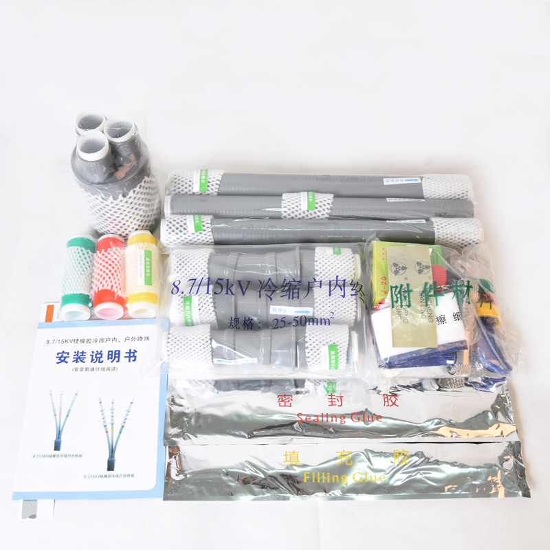 產品特點:8.7-15kv冷縮電纜附件抗污穢、耐老化、憎水性好,具有耐寒性能。